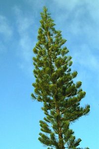 Diese immergrüne und extrem schlankwachsende Araukarie kann eine Wuchshöhe von etwa 60 Meter erreichen. Da Araucaria columnaris eine spitze Krone entwickelt werden die Zweige in der Kronenspitze immer kürzer. Der Stamm bildet keine Seitenarme.
